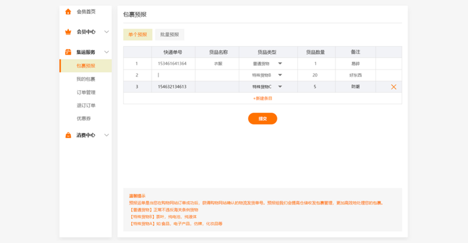 貨物發貨後獲得快遞單號,將快遞單號以及貨物名稱填寫提交預報,等待入庫上架可一次預報一個或批量添加多個