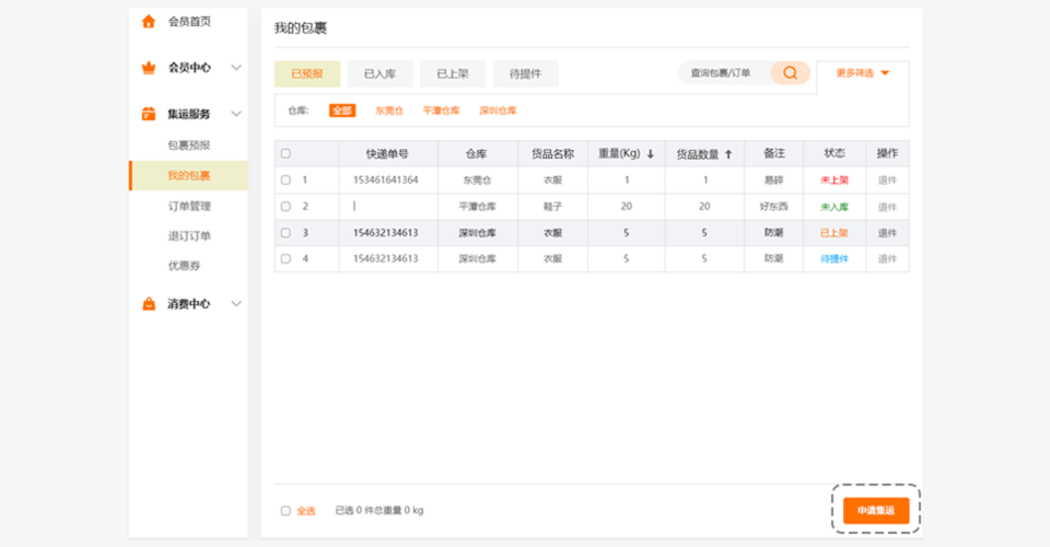 申請集運需要等貨物入庫、上架方可操作。可一次申請全部或者單件貨物